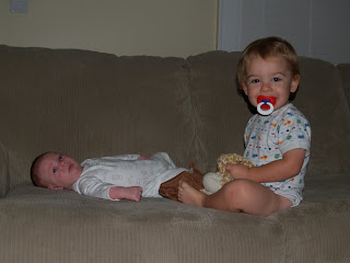 Ok. So last week someone gave Silas this outfit, and I was so excited, because it matched Asher's Easter outfit from this spring (by the way - at Easter, that outfit was on the cusp of being too big. By August, it's on the cusp of being too small. Good grief. But I digress). So I dressed them up for church this Sunday, and figured I was getting it in right under the wire. If girls can't wear white after Labor Day, surely boys can't wear searsucker. This was my last chance to get a picture of them in their little outfits together. Except - Silas was sleepy and INSULTED that I had plans for him that did not include his bed, and Asher had Very Important Things To Do that did not involve sitting still for the camera. I didn't get a single good picture. But at least you can see the outfits in this one - sort of.