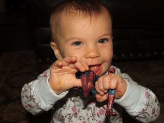 Love this picture. She loves that rubber dinosaur. It's her favorite chew toy.